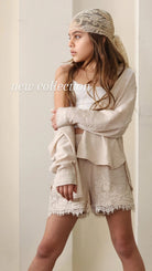 סט שורט מושלם לילדות המשלב נוחות ועיצוב מתוחכם. הסט כולל חולצה מכופתרת עם שילובי תחרה עדינים, שורט נוח ובנדנה תואמת שמשלימה את המראה.
