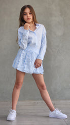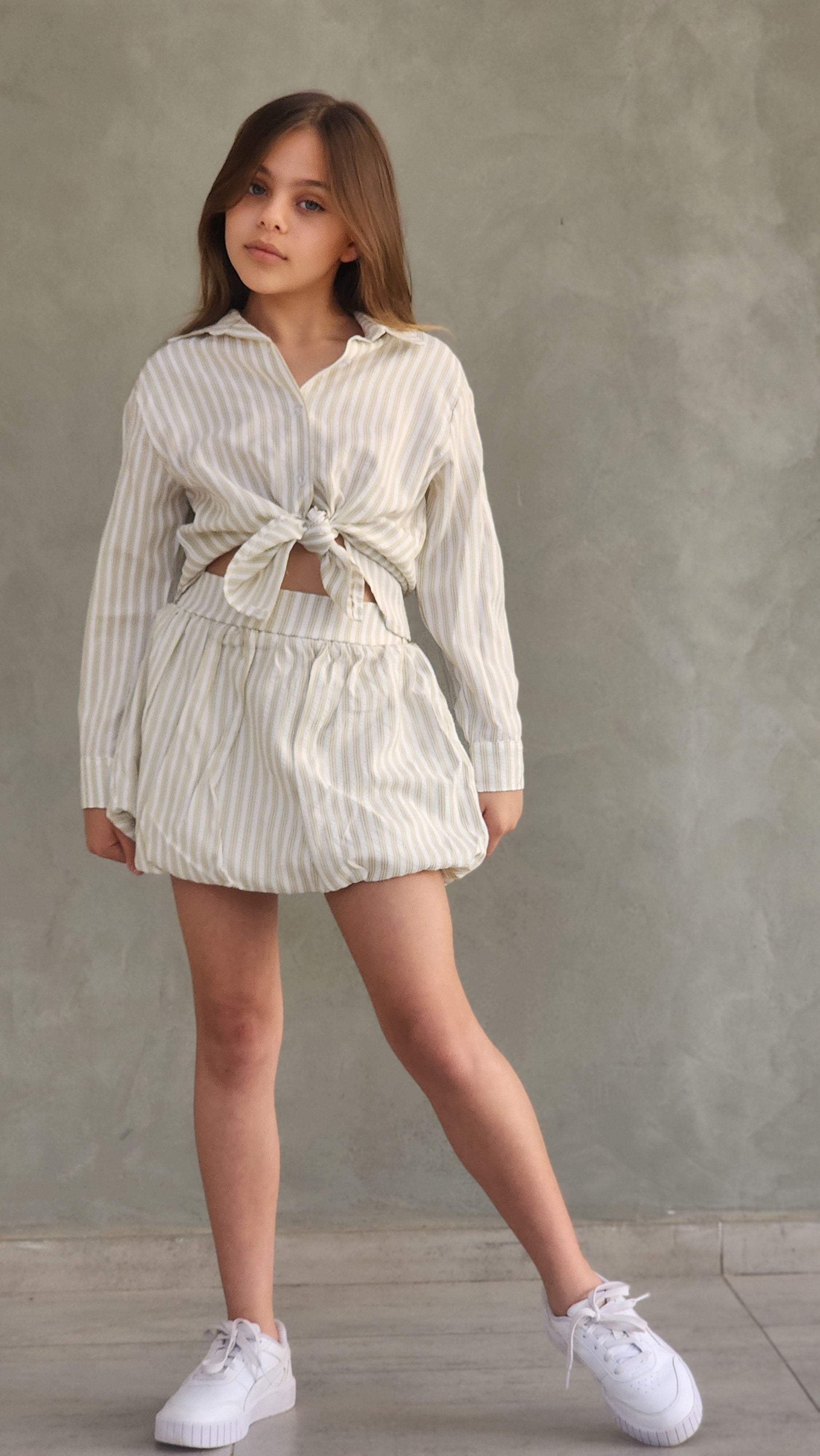 סט קלאסי ומושלם לבנות בעיצוב פסים נצחי. הסט כולל חצאית בלון נפוחה וחולצה מכופתרת אלגנטית המשלבות נוחות ומראה מעודן.