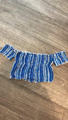 חולצת סטרפלס עם כיווצים צבעים- לבן דפוס פסים ושפתיים שחור דפוס פסים ושפתיים תכלת- פסים לבן וכחולים