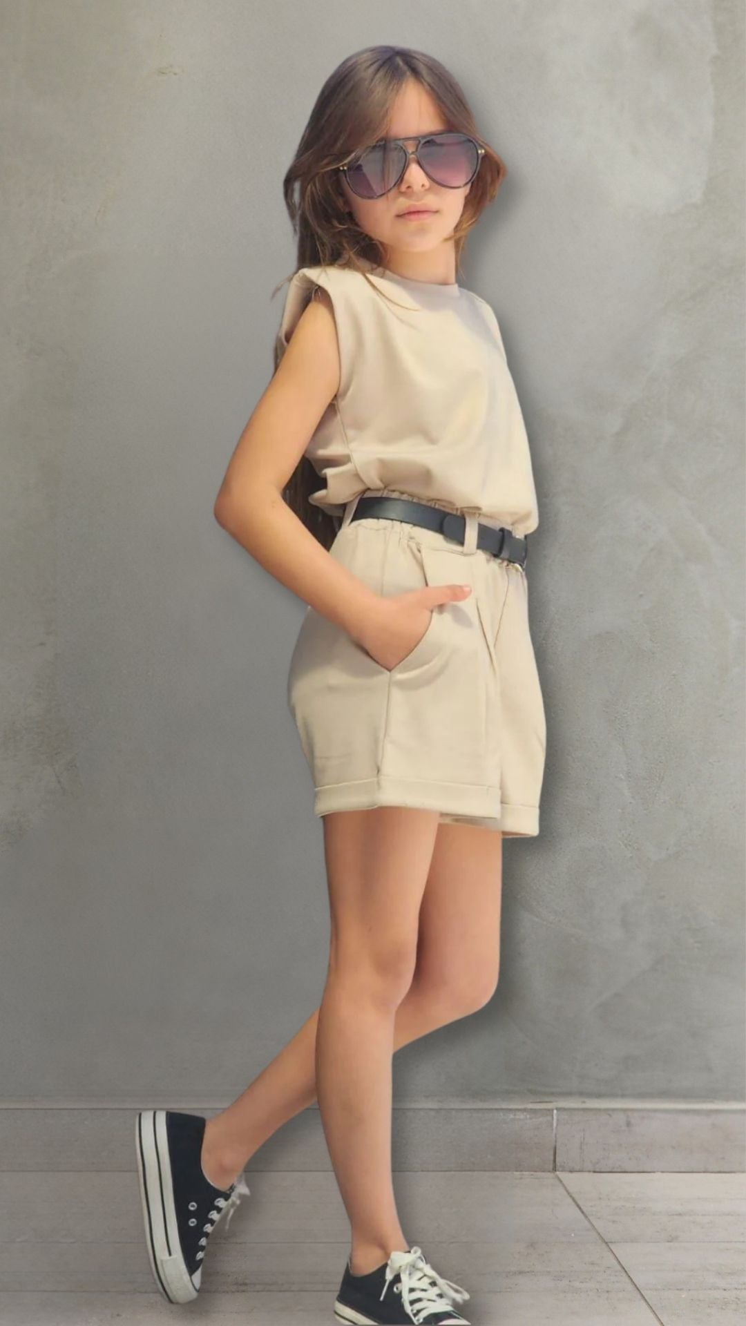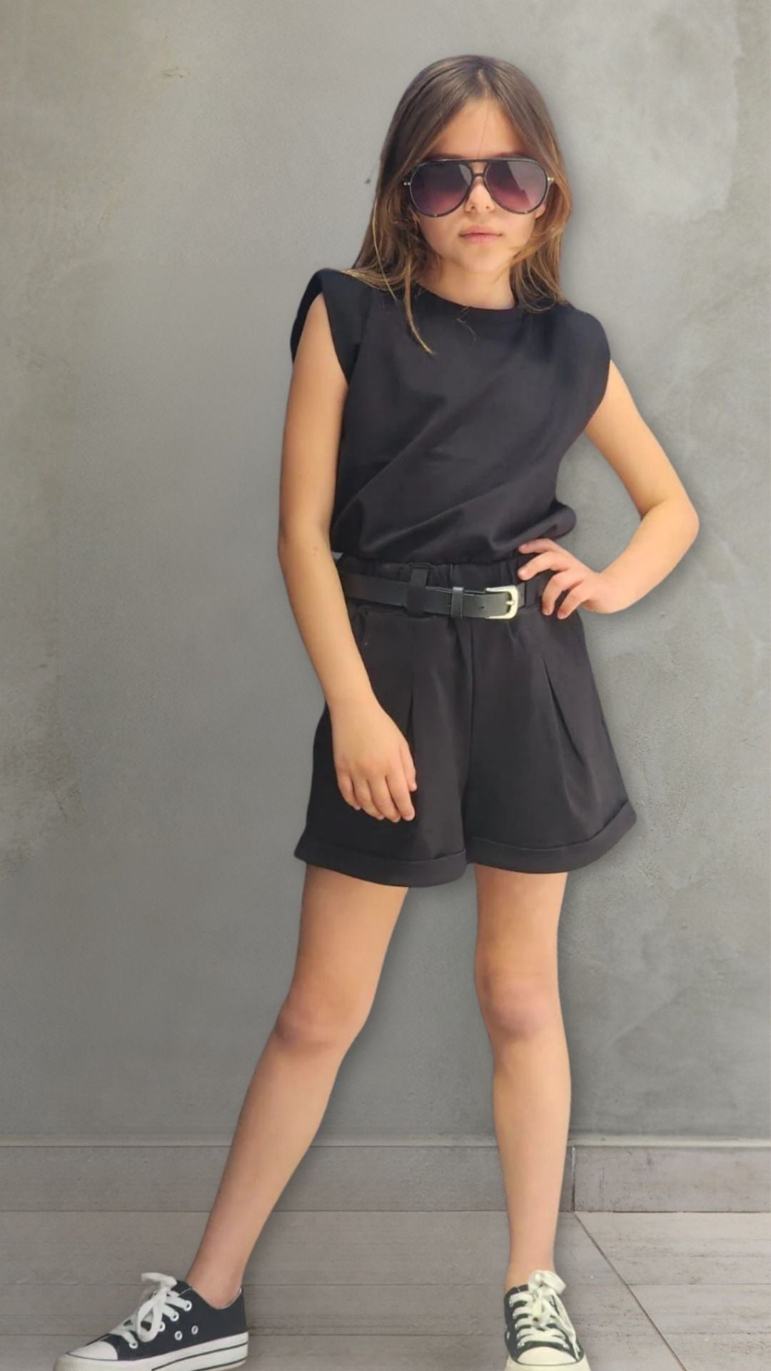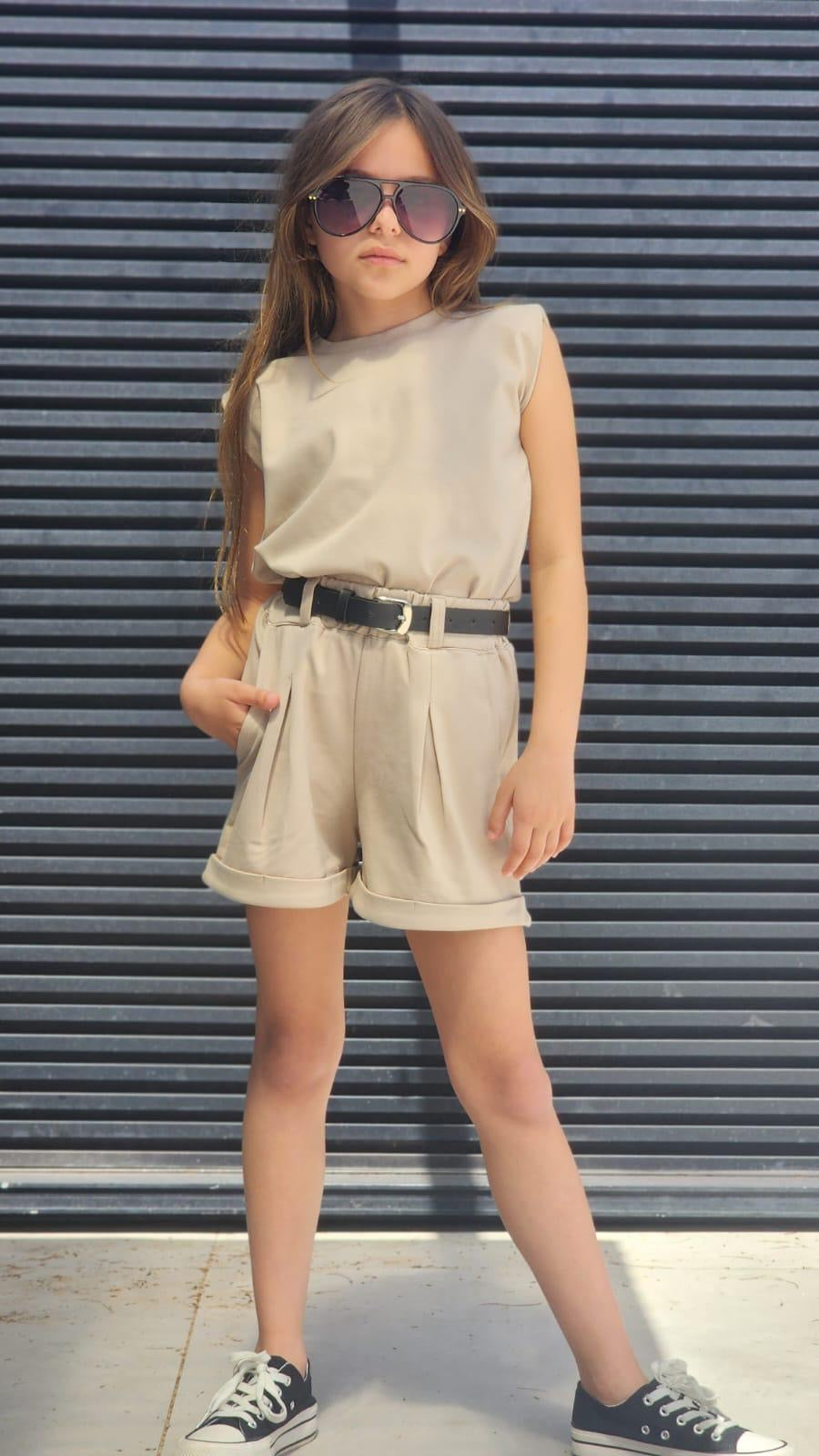 סט שורט פנס עם חגורה וחולצה עם כריות כתף בד ג'רסי