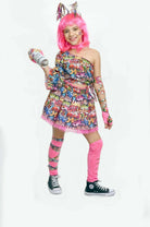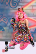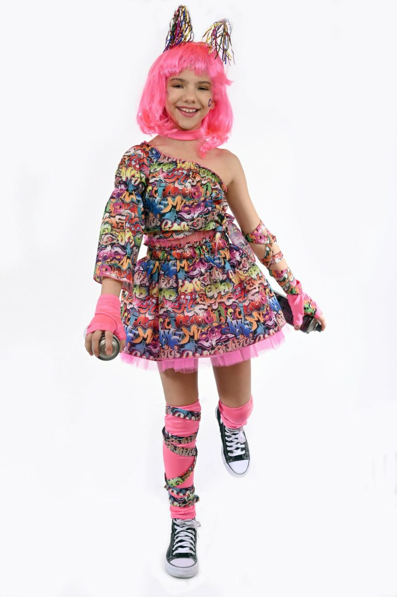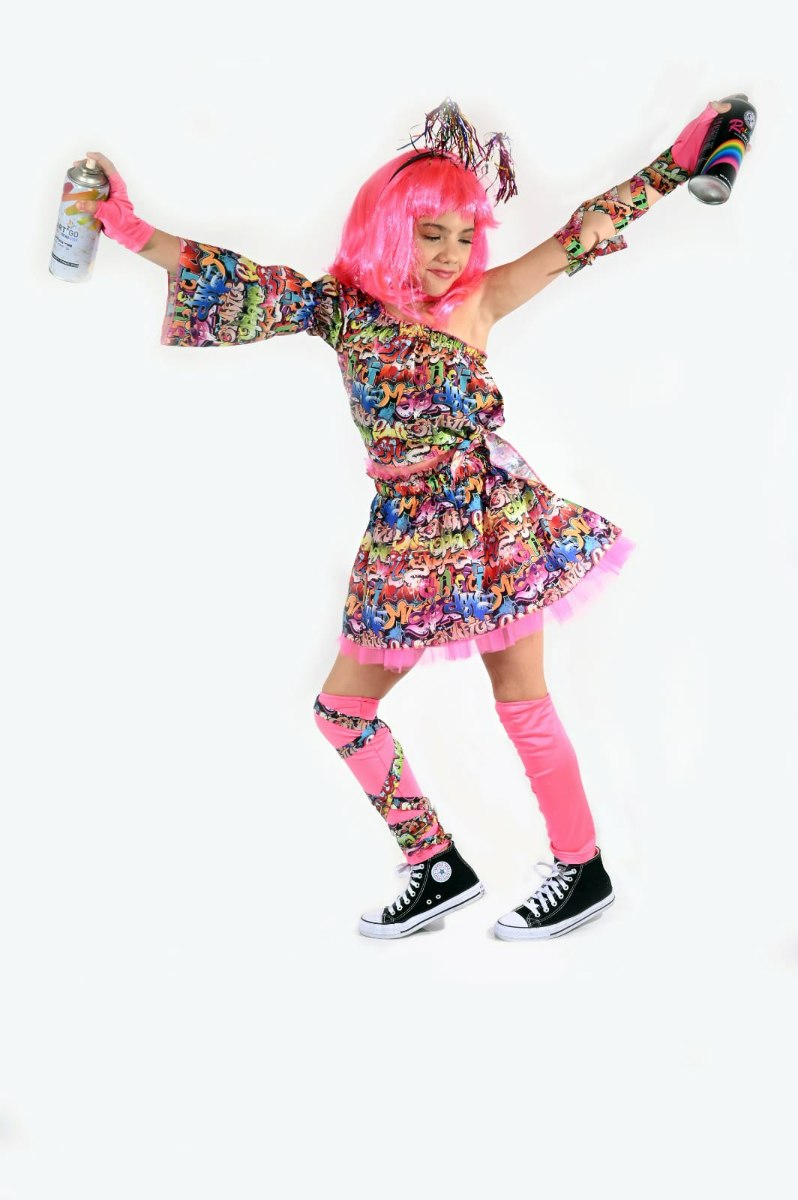 מלכת הגרפיטי התחפושת כוללת: חולצת כתף אחת חצאית בשילוב טוטו קולר פיאה+קשת כפפות לידיים עם קשירה חותלות לרגלים