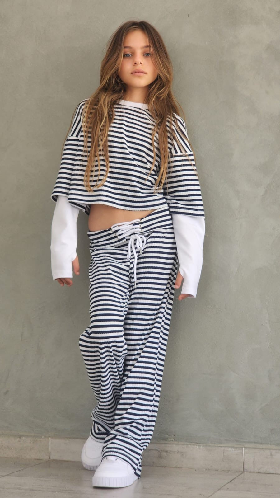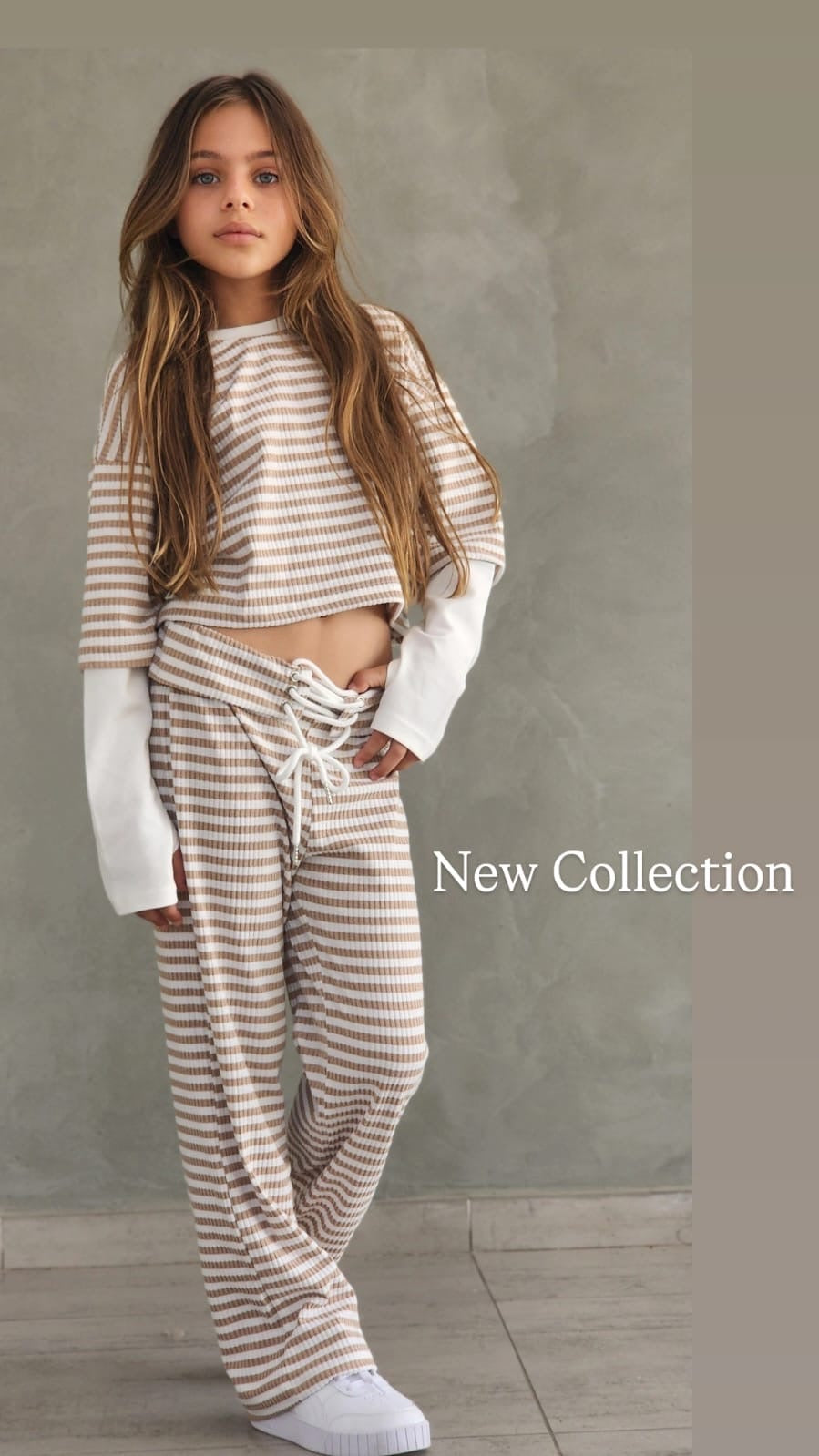 חליפת סריג פסים קשירה שרוך וחולצת קרופ שילוב שרוול כפפה