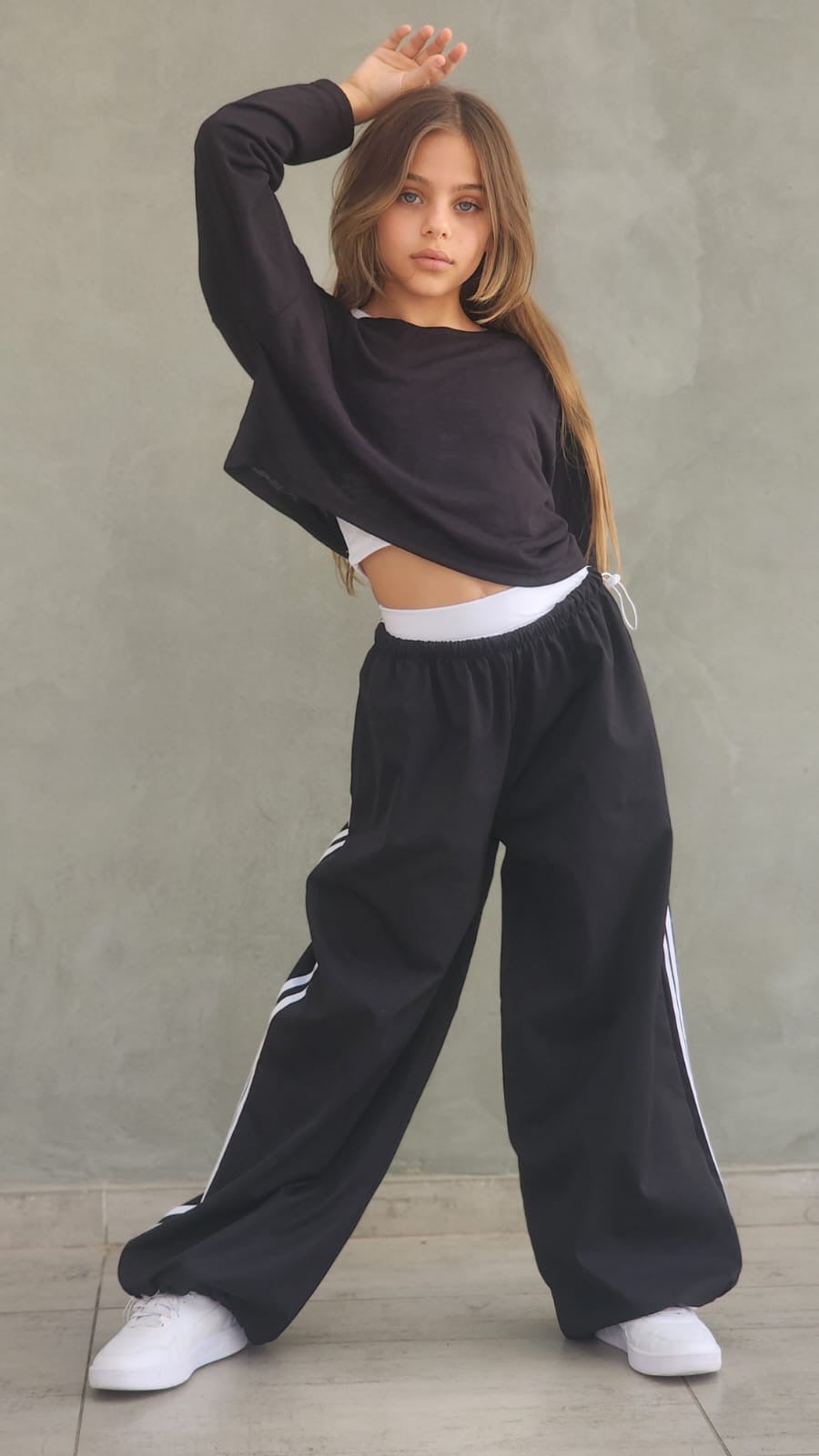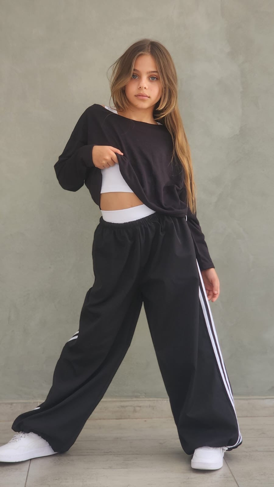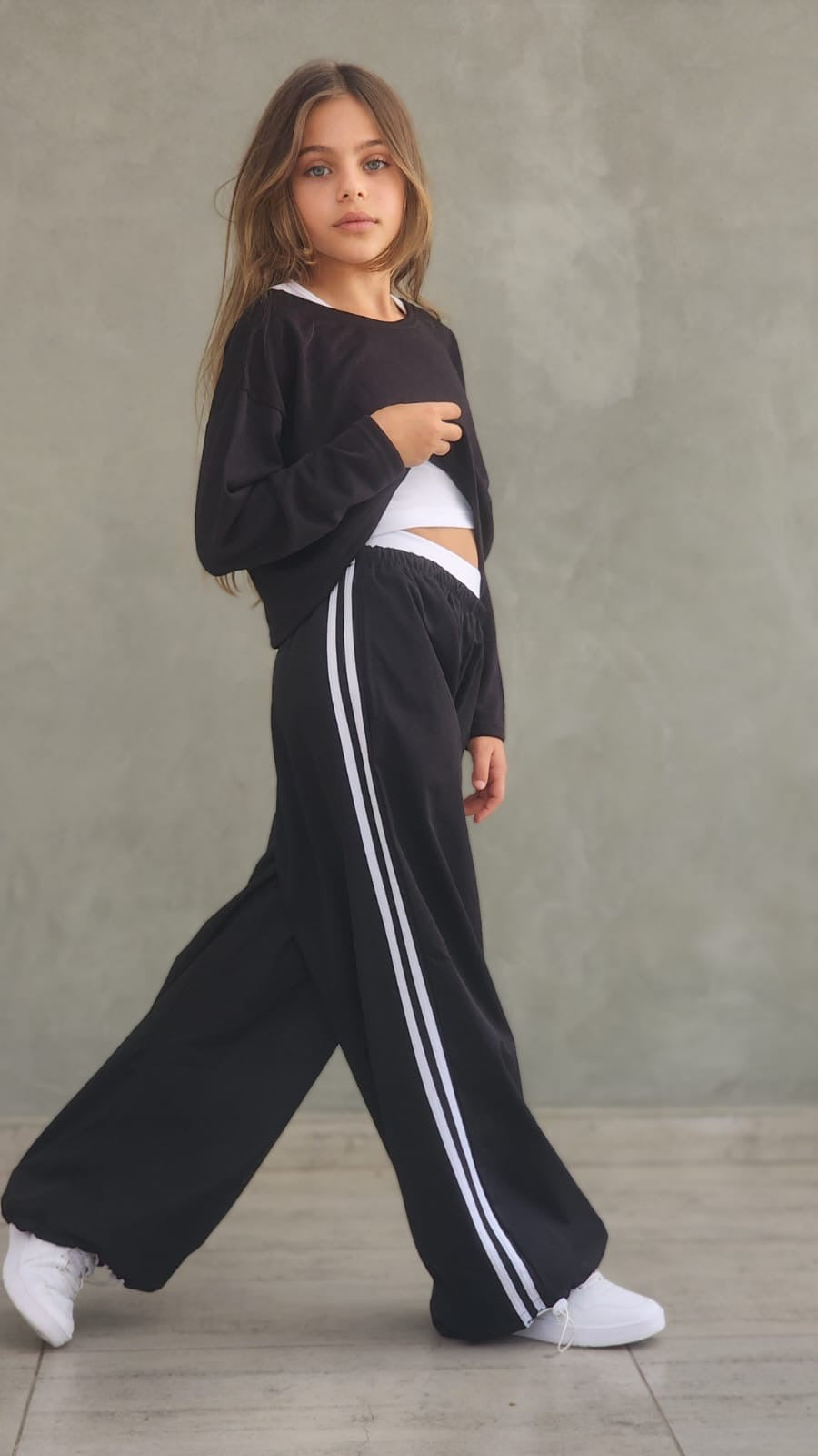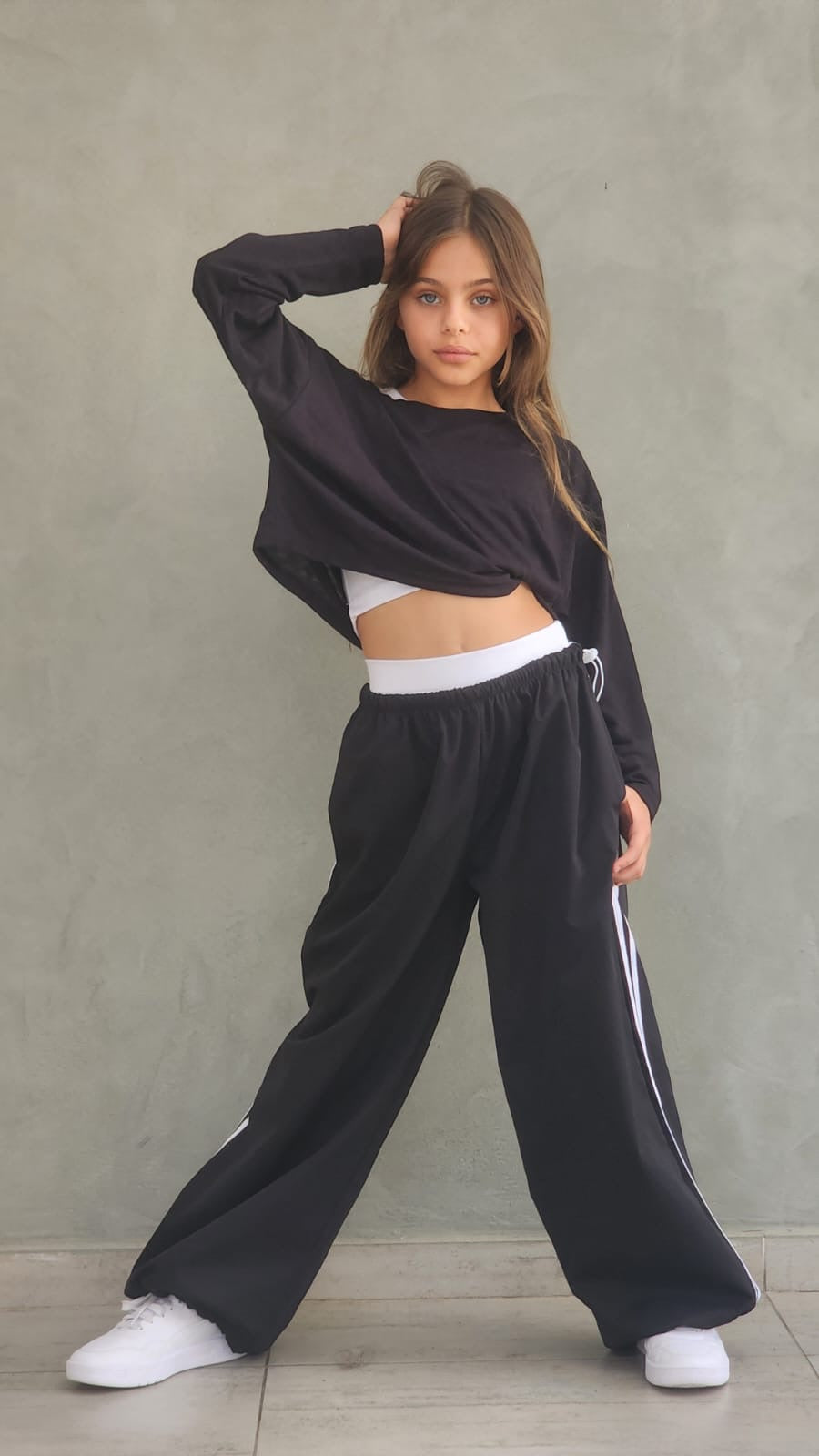 סט היפ הופ 4 חלקים.מכנס פרשוט עם סטופרים,טייץ קצר לבן,גוזייה לבנה וחולצת סלאב שרוול ארוך