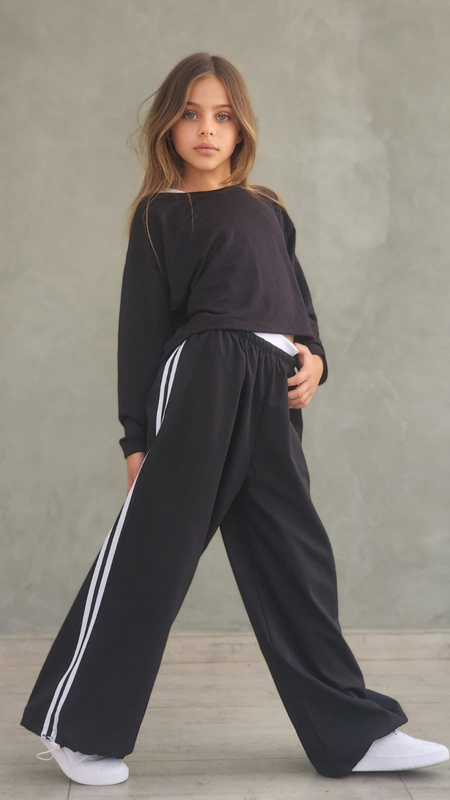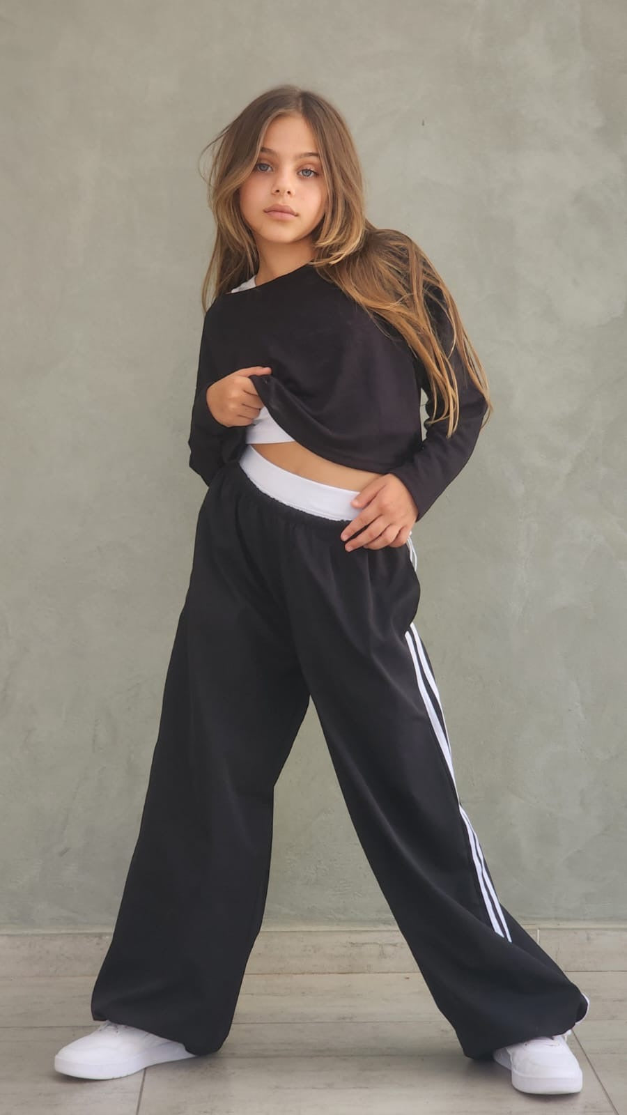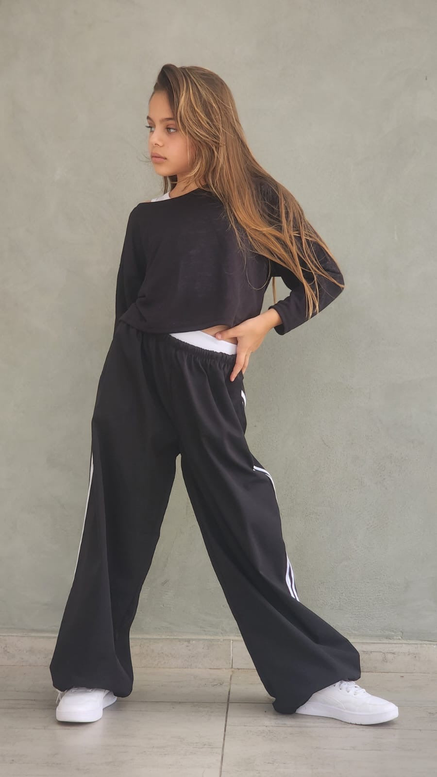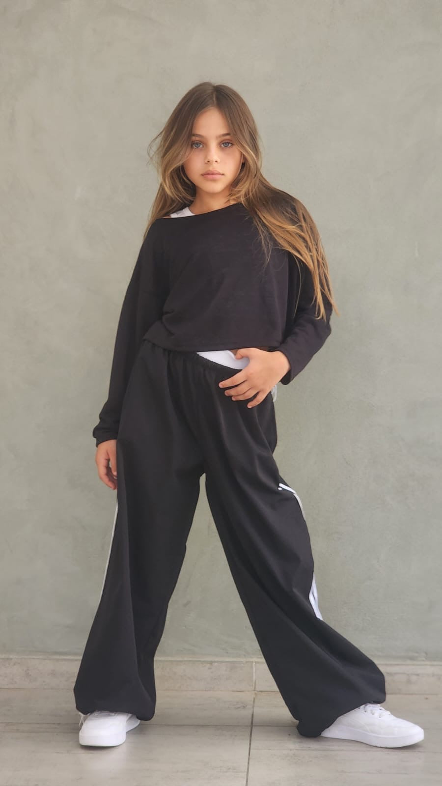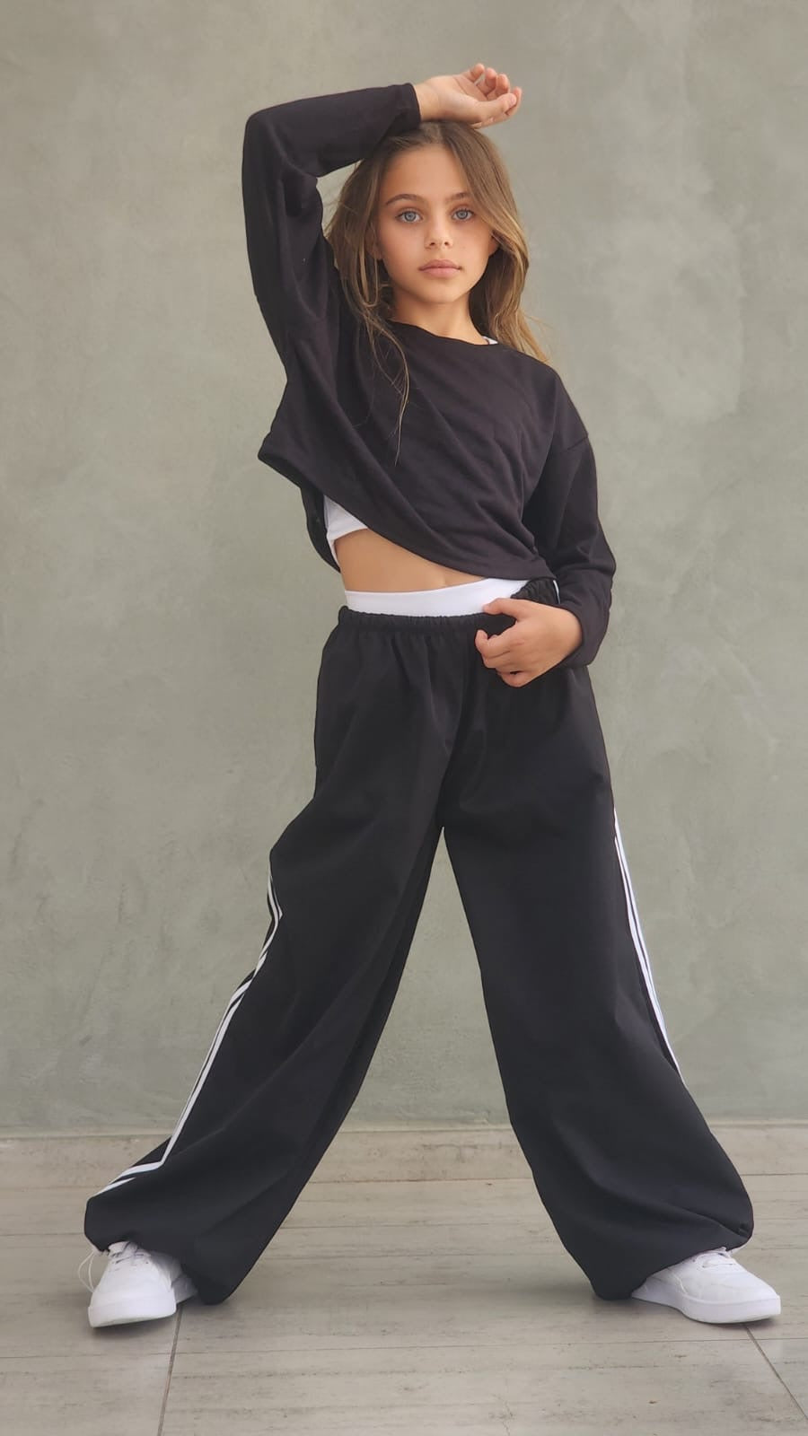 סט היפ הופ 4 חלקים.מכנס פרשוט עם סטופרים,טייץ קצר לבן,גוזייה לבנה וחולצת סלאב שרוול ארוך
