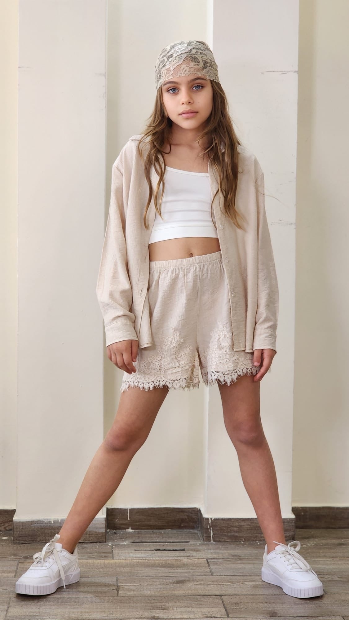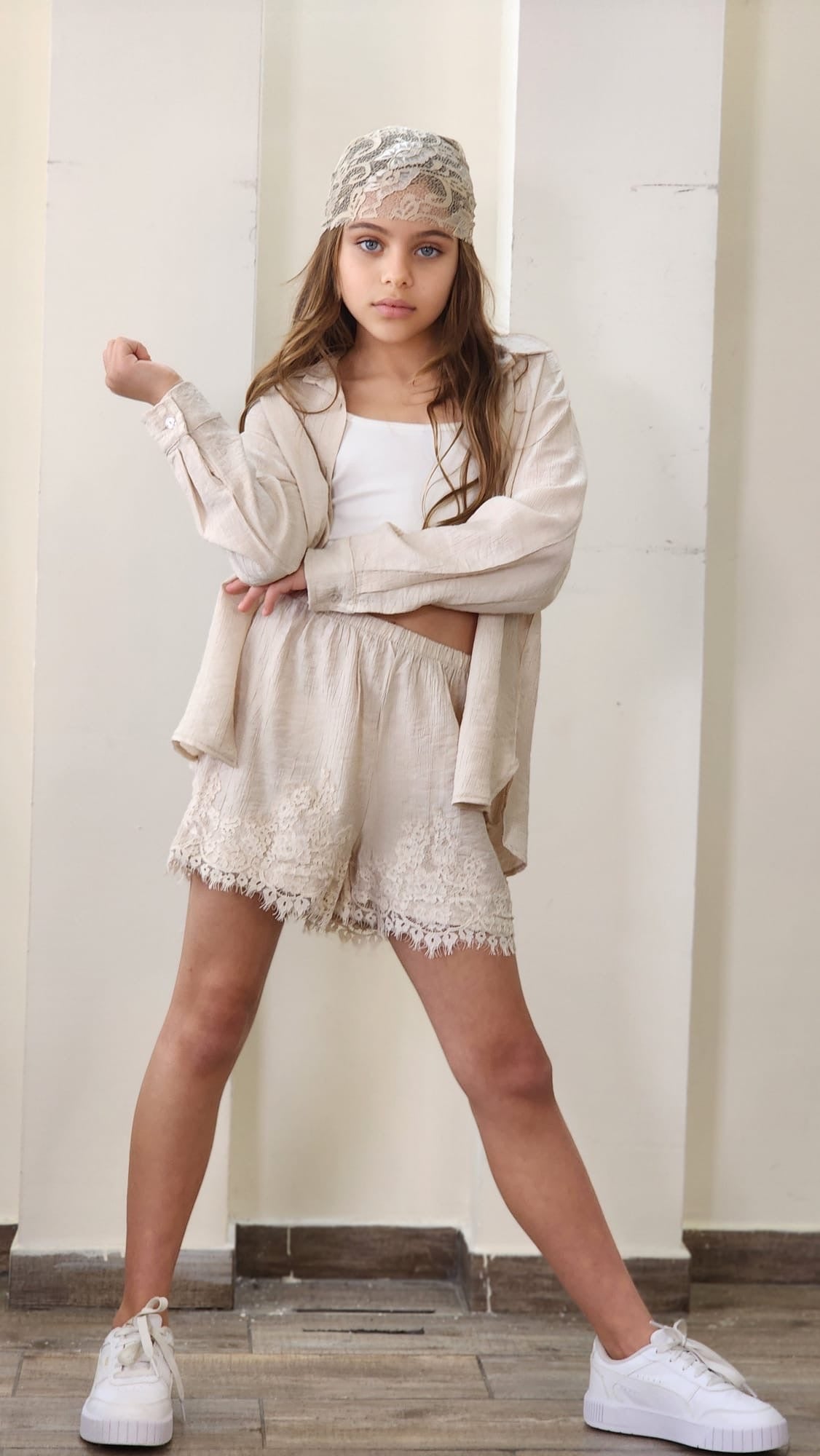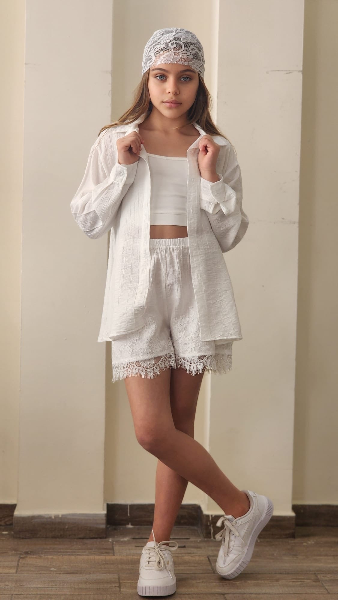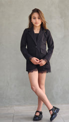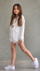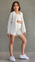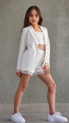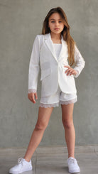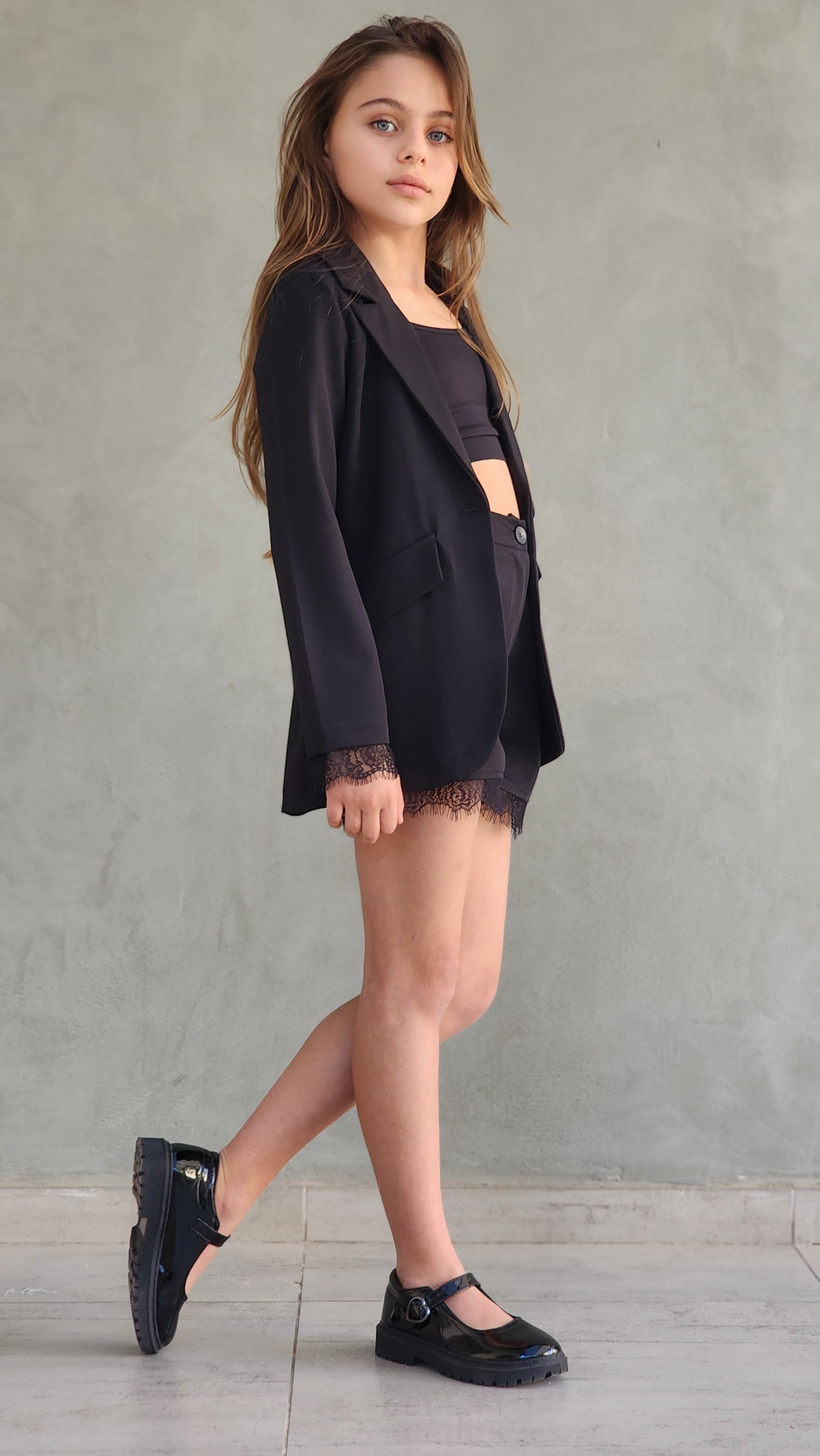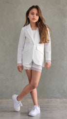 סט חגיגי לבנות המשלב אלגנטיות ונוחות. הסט כולל שורט עם שילובי תחרה עדינים, ג'קט שרוול ארוך עם פרטי תחרה וגוזייה תואמת.