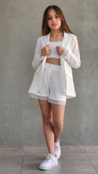 טיפ סטיילינג: שלבי את הסט עם נעלי בובה קלאסיות ותיק קטן לאירועי חג וטקסים משפחתיים. לקבלת מראה יומיומי יותר, הסירי את הג'קט והשאירי את השורט והגוזייה עם סניקרס לבנים.