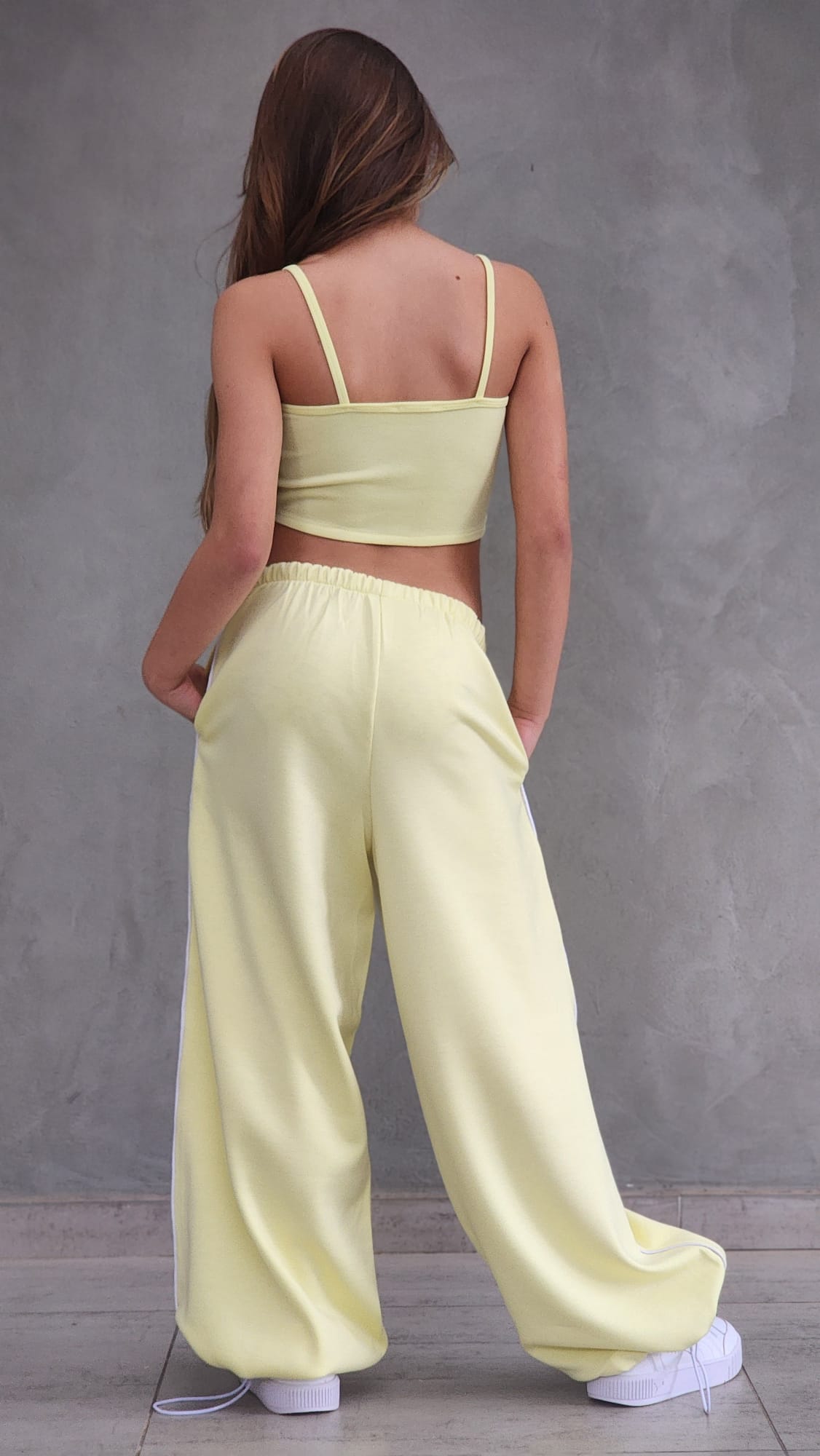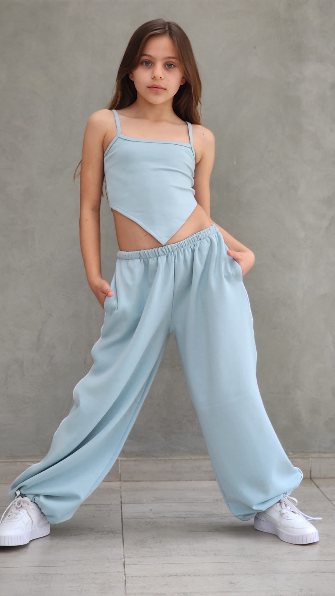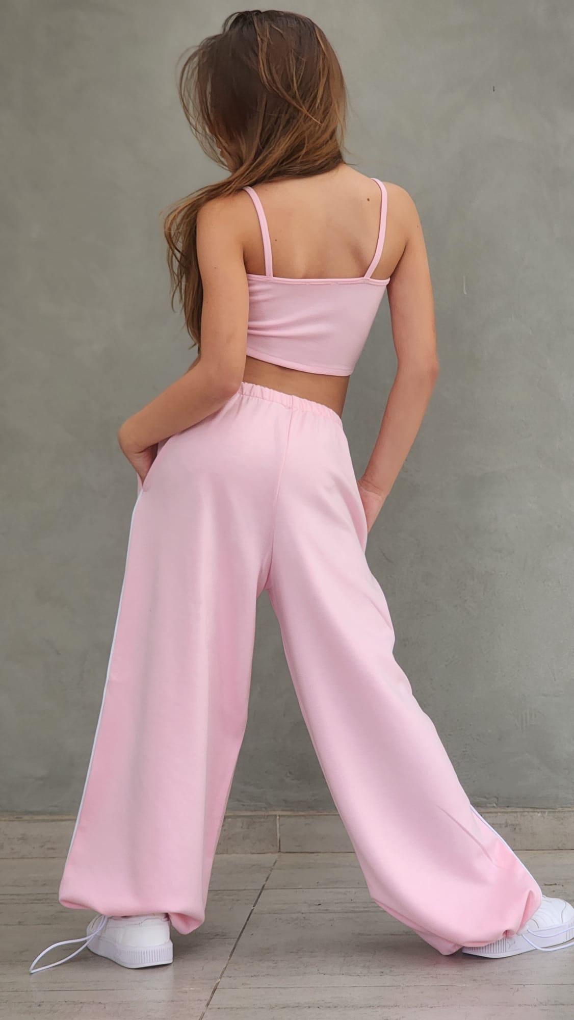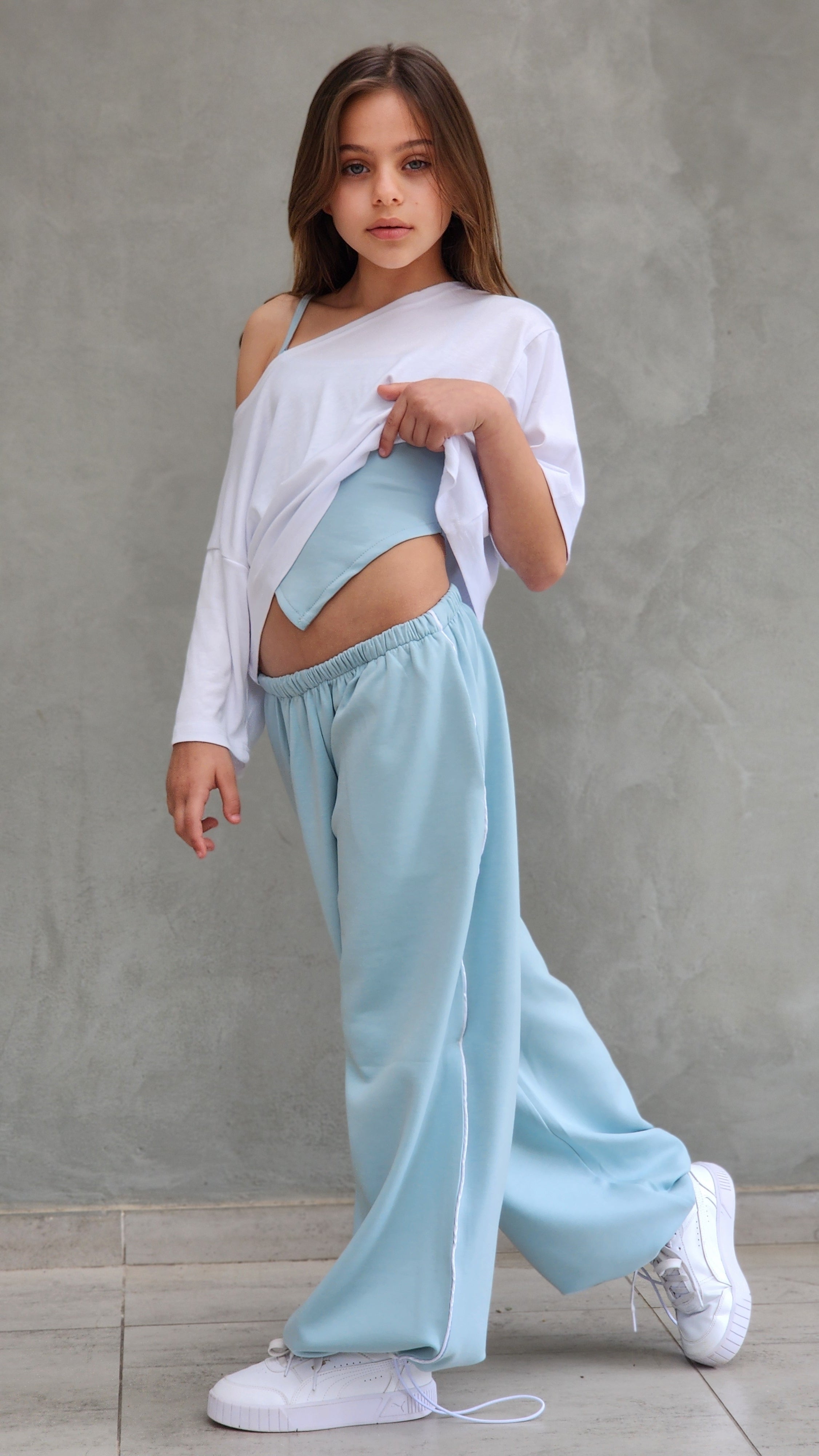 שילוב מושלם של נוחות וסטייל עכשווי. הסט כולל מכנס ספורט ארוך עם פס בצד, כיסים נוחים וגומי סטופר בסוף הרגל, גוזיית שפיץ אופנתית וחולצת קרופ לבנה מעל.