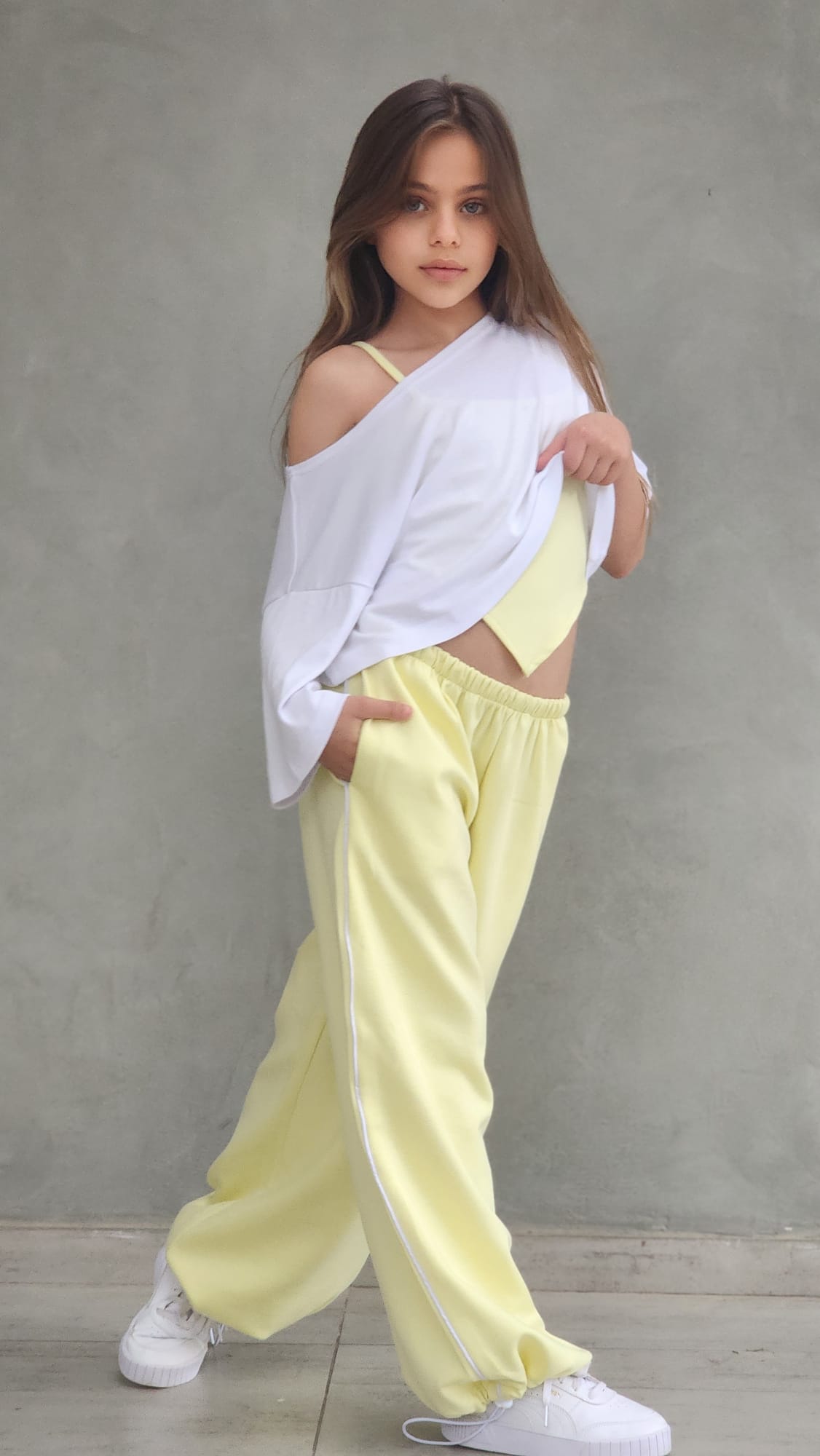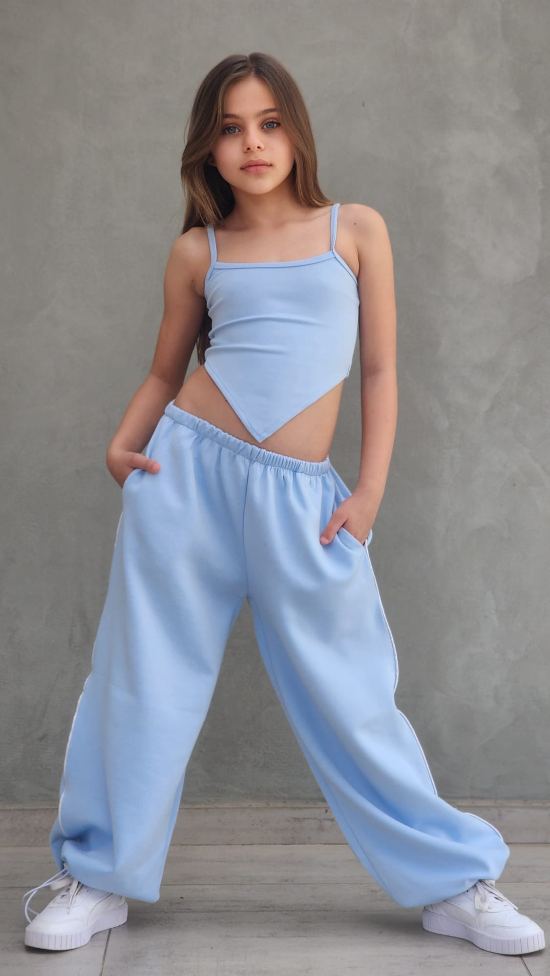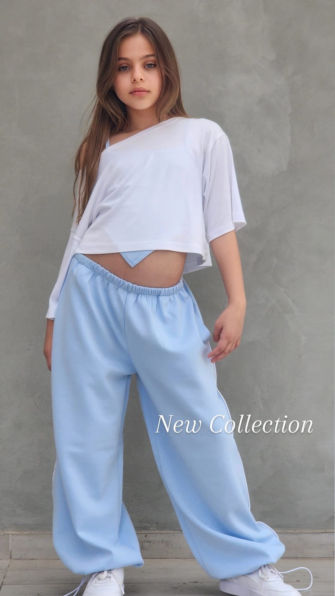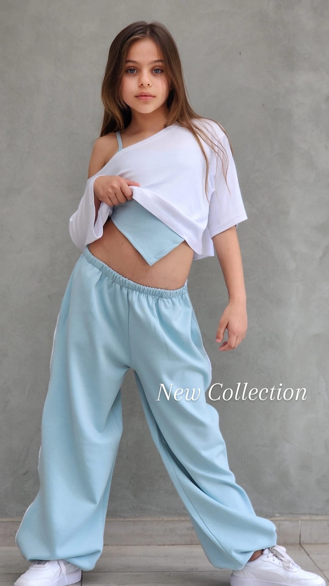 שילוב מושלם של נוחות וסטייל עכשווי. הסט כולל מכנס ספורט ארוך עם פס בצד, כיסים נוחים וגומי סטופר בסוף הרגל, גוזיית שפיץ אופנתית וחולצת קרופ לבנה מעל.