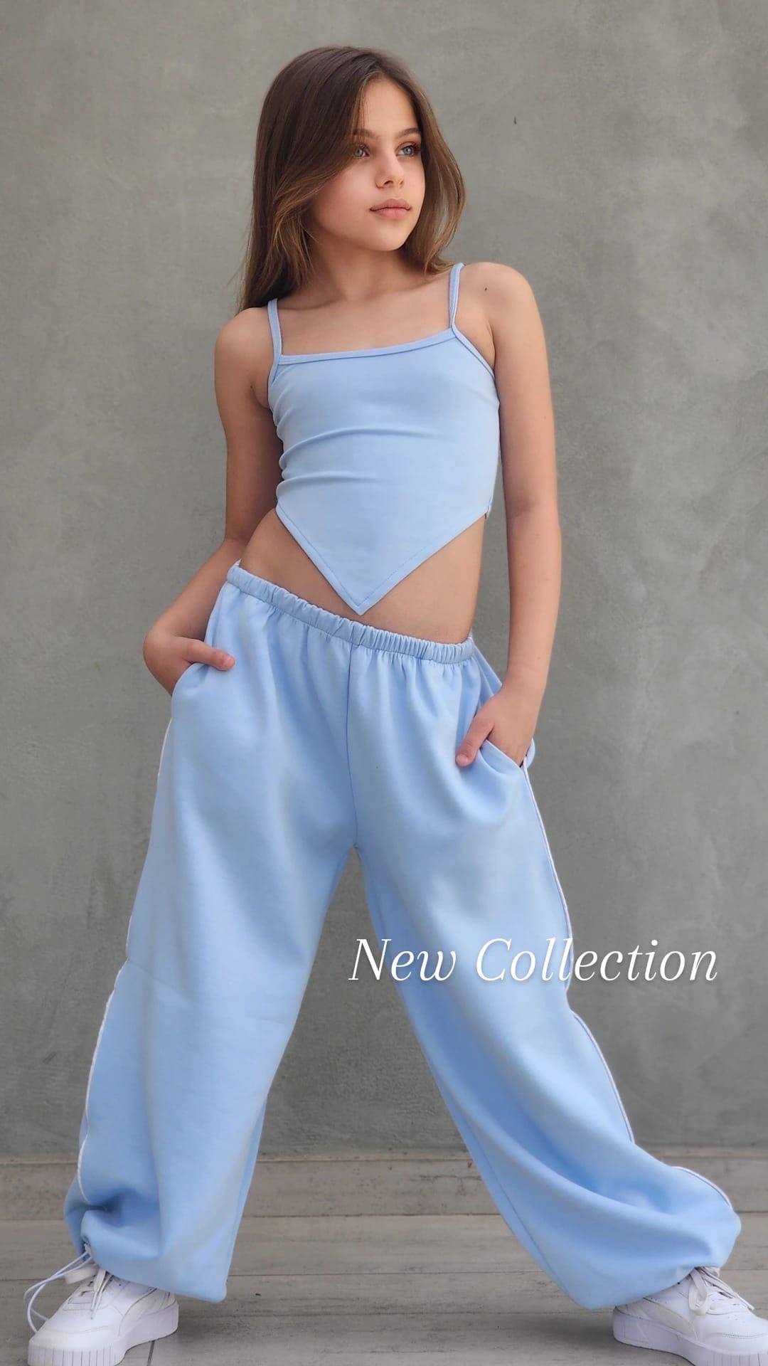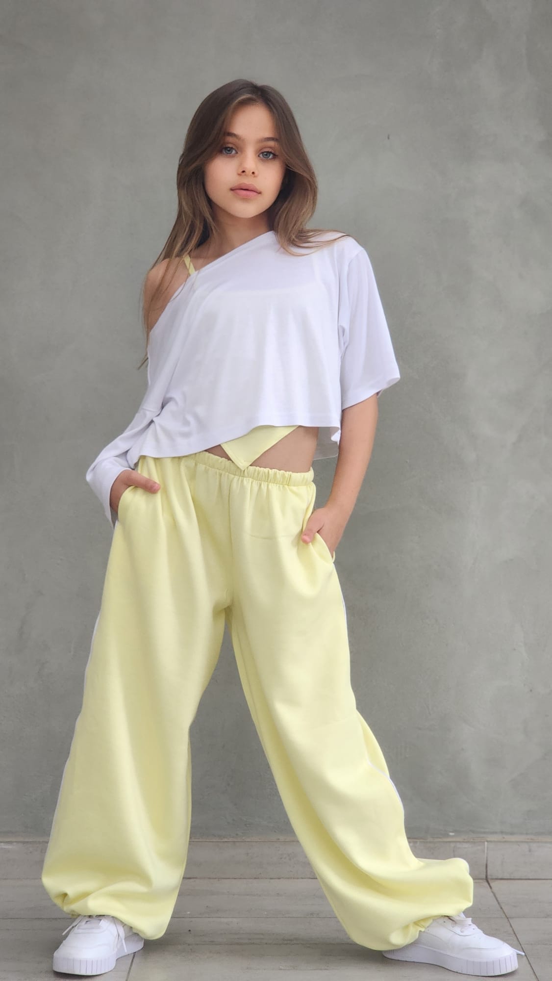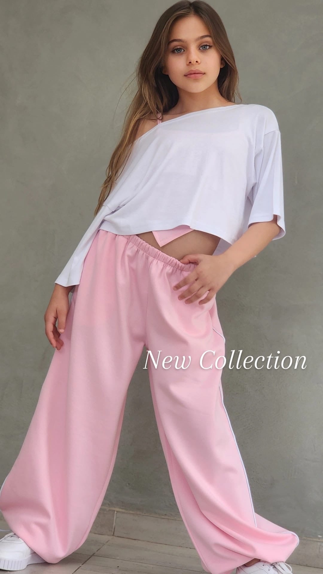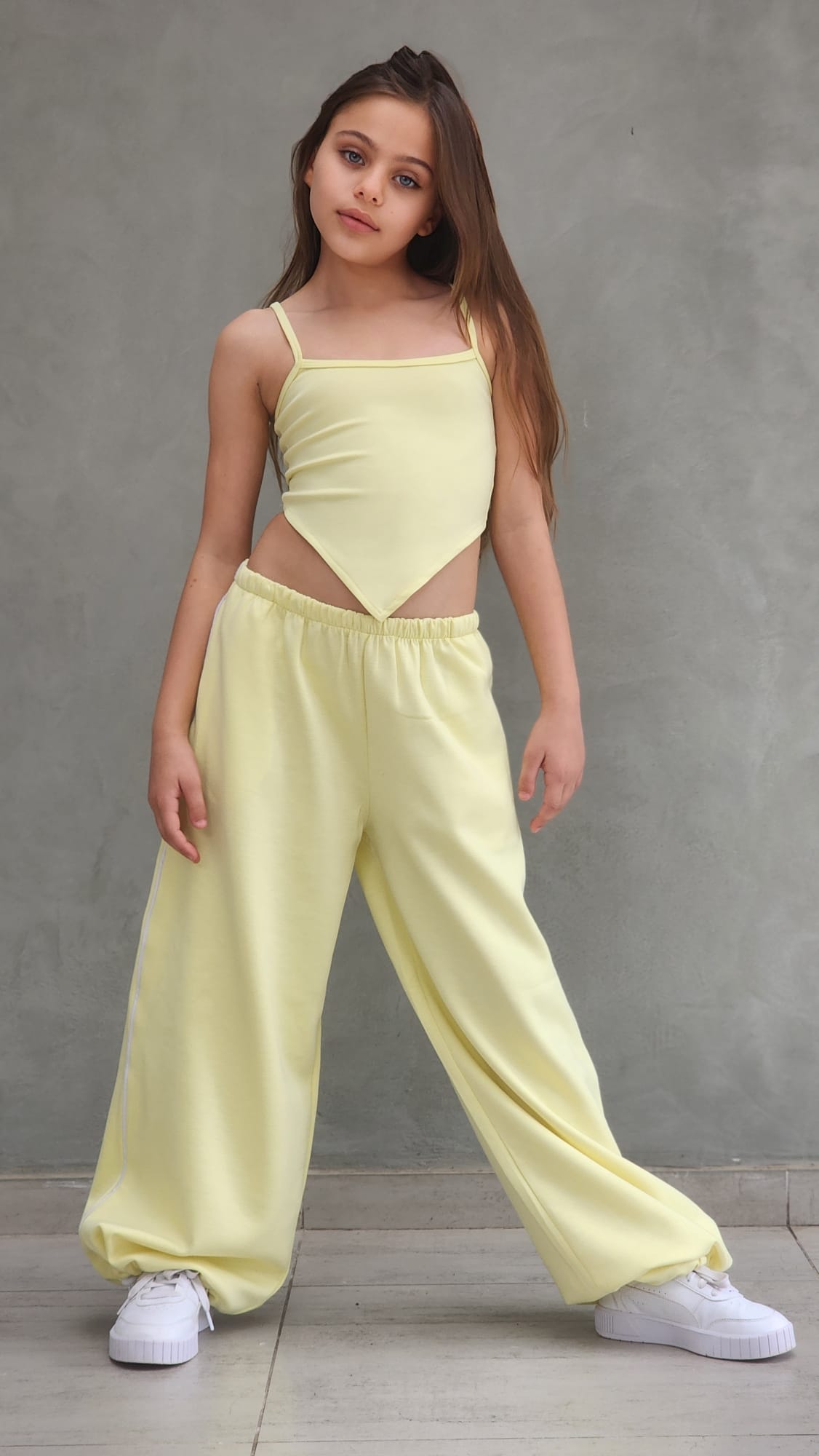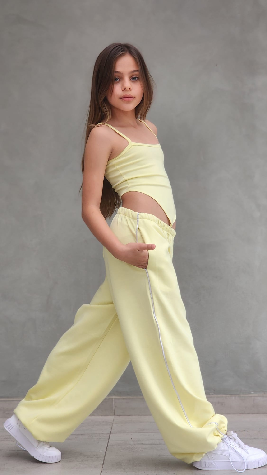 שילוב מושלם של נוחות וסטייל עכשווי. הסט כולל מכנס ספורט ארוך עם פס בצד, כיסים נוחים וגומי סטופר בסוף הרגל, גוזיית שפיץ אופנתית וחולצת קרופ לבנה מעל.