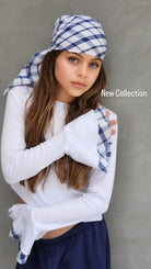 סט מכנס פרנצ'טרי שילוב משבצת עם חולצה שרוול פעמון משולב ובנדנה