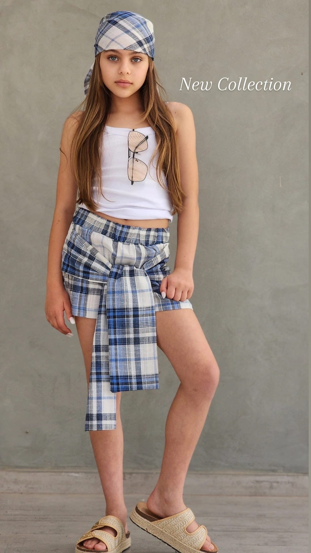 סט קיץ מעוצב ומיוחד לבנות הכולל שלושה פריטים: שורט משבצות, בנדנה תואמת וגופיית ריב נוחה. שילוב מנצח של סטייל, נוחות וחופש תנועה - מושלם לימי קיץ פעילים.