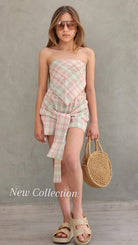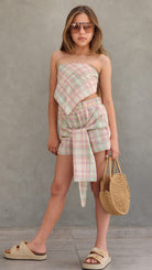 סט שורט משבצות עם בנדנה/חולצת סטרפלס וגופיית ריב לבנה